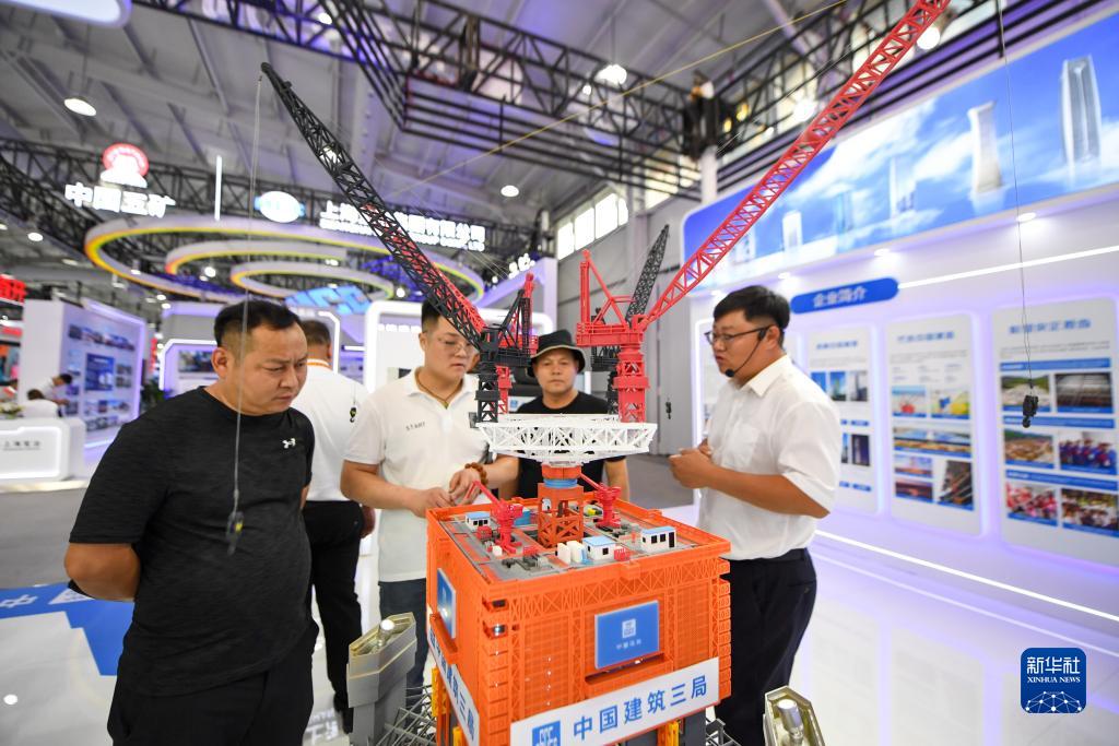 9月5日,在服貿會首鋼園區(qū)的工程咨詢與建筑服務專題展內,中建三局的工作人員(右一)介紹一款超高層建筑智能化施工裝備集成平臺。