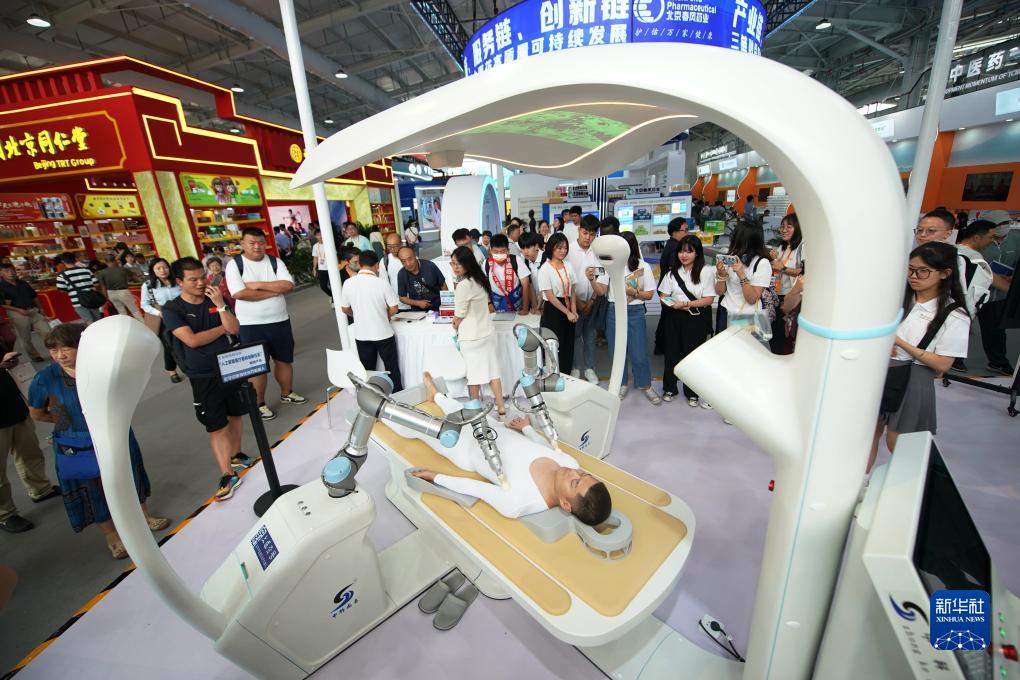9月5日,參觀者在服貿(mào)會(huì)首鋼園區(qū)的健康衛(wèi)生服務(wù)專題展內(nèi)觀看數(shù)字中醫(yī)循經(jīng)治療機(jī)器人展示。