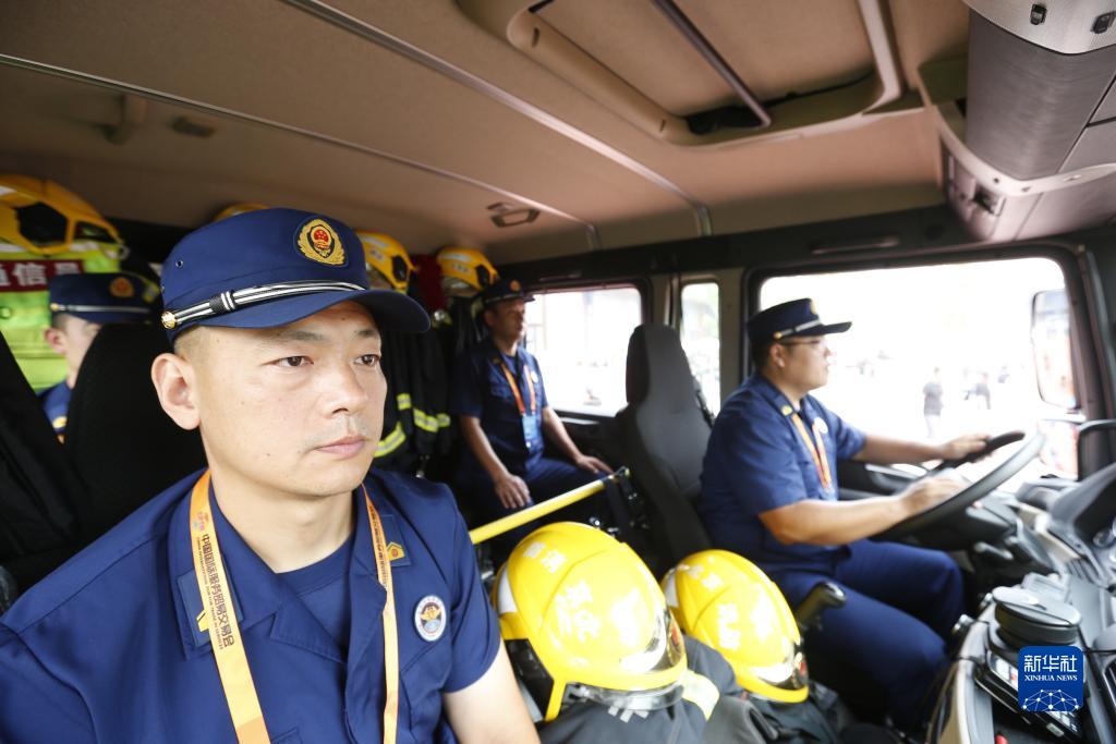 9月5日,石景山消防救援支隊的消防員在服貿會首鋼園區的消防車上備勤。