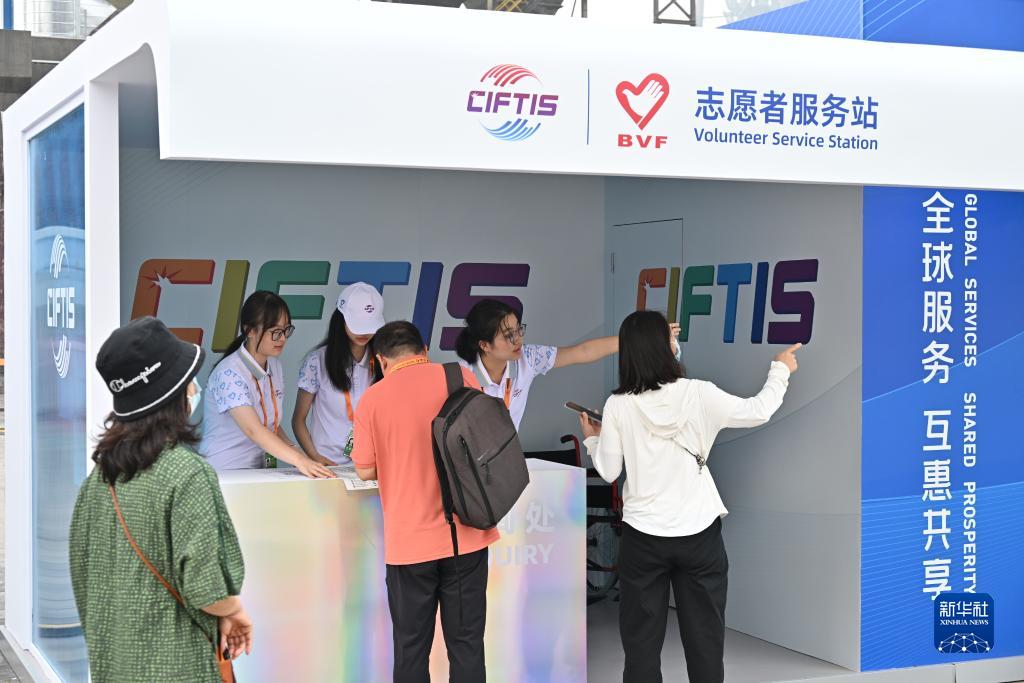 9月5日,北京理工大學(xué)的三名大學(xué)生志愿者在服貿(mào)會首鋼園一處的志愿者服務(wù)站給參觀者指路。