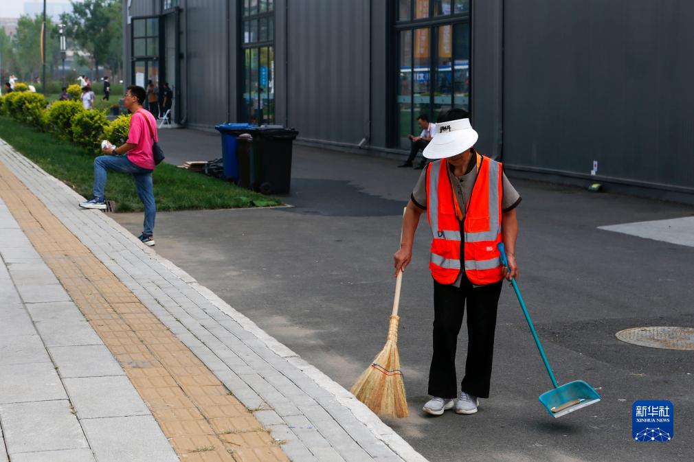 9月5日,保潔員在首鋼園區清掃地面。