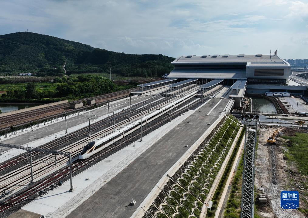 9月5日,一列試運行列車駛出江陰站(無人機照片)。