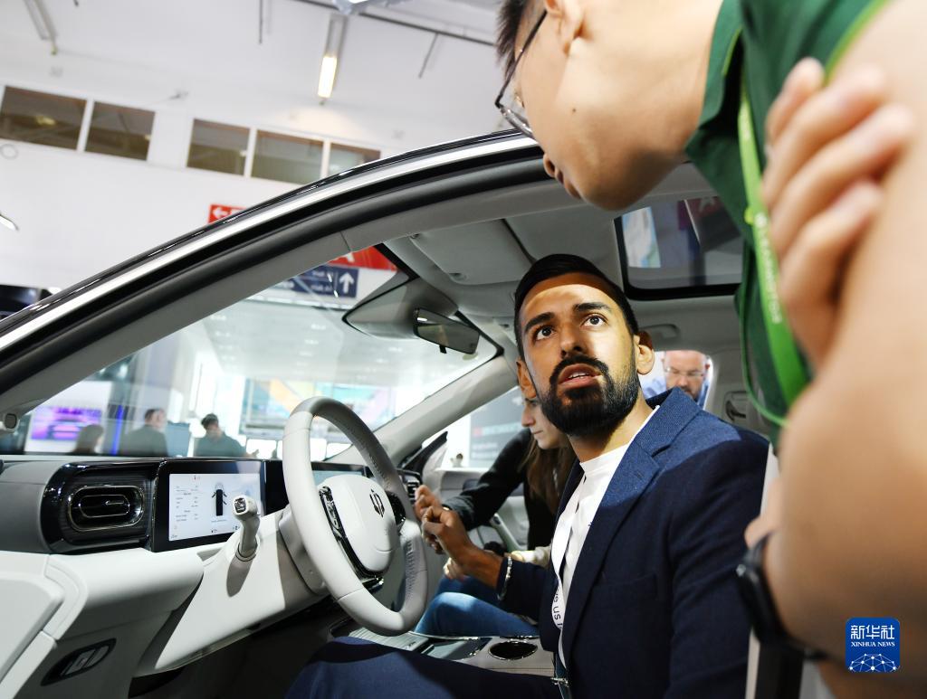 9月5日,在德國慕尼黑,參觀者在德國國際汽車及智慧出行博覽會的零跑汽車展區與工作人員交流。
