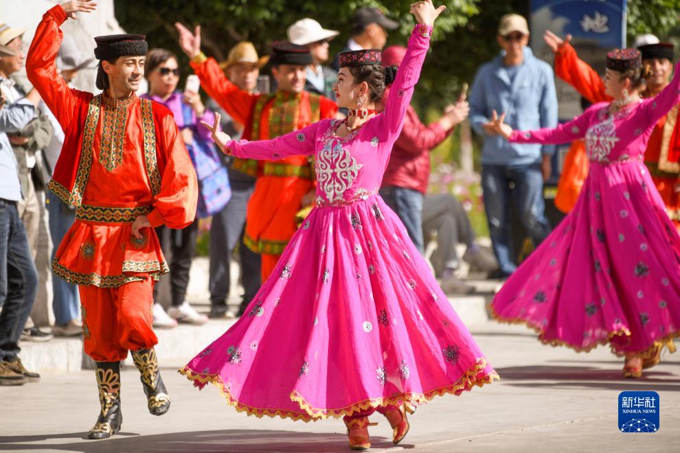 在新疆塔什庫爾干塔吉克自治縣帕米爾旅游區游客服務中心,縣文工團演員跳舞歡迎游客(9月4日攝)。