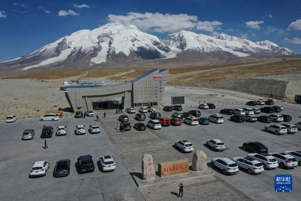 自駕游客的車輛停靠在新疆塔什庫爾干塔吉克自治縣慕士塔格冰川公園門前(9月1日攝,無人機照片)。