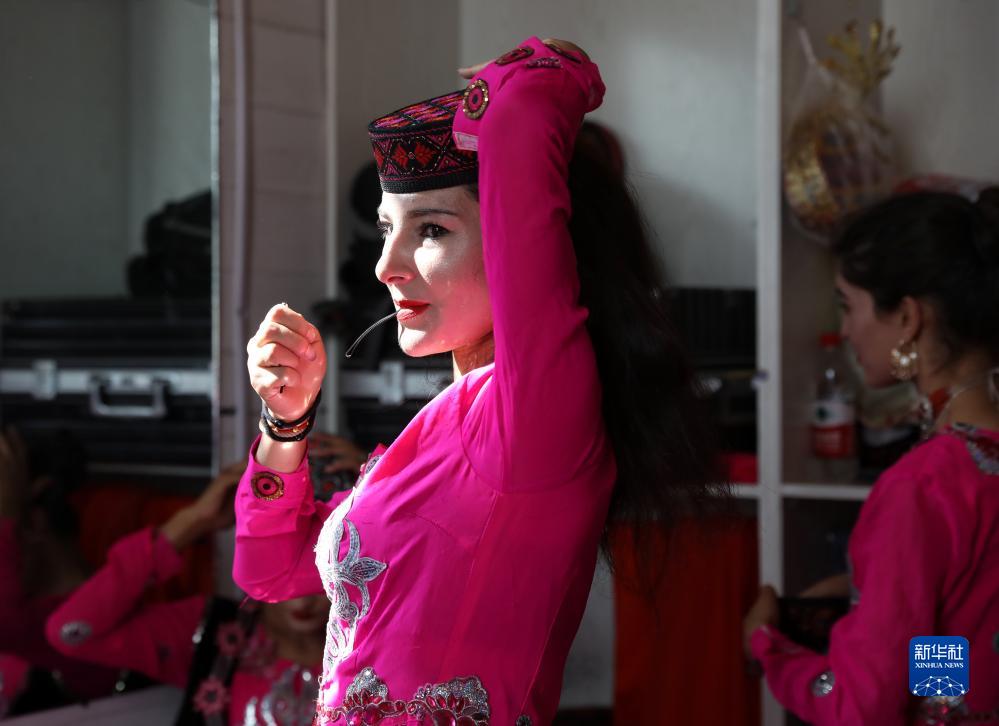 在新疆塔什庫爾干塔吉克自治縣帕米爾旅游區游客服務中心,縣文工團演員在演出前做準備(9月4日攝)。