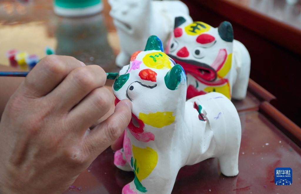 9月5日,在山東省高密市姜莊鎮的一處非遺工坊,村民在制作泥老虎產品。