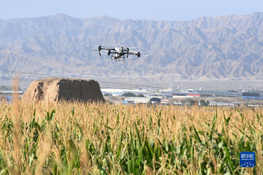 這是9月5日在山丹縣位奇鎮十里堡村拍攝的“一噴多促”作業現場。