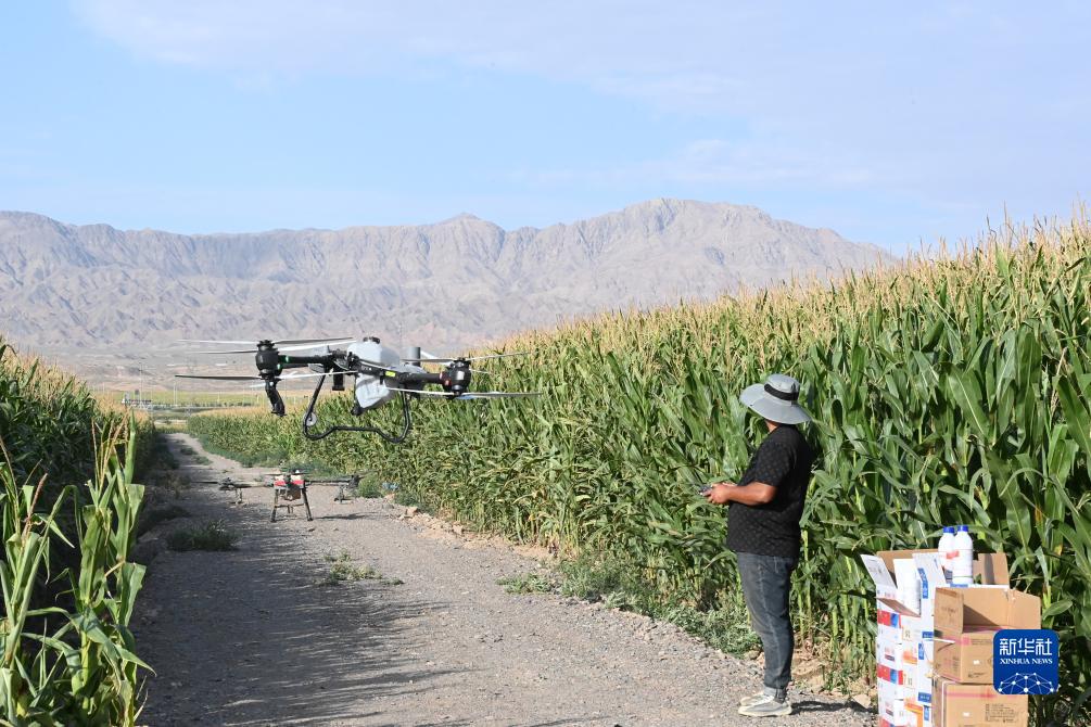 9月5日,在山丹縣位奇鎮十里堡村,技術人員開展“一噴多促”作業。