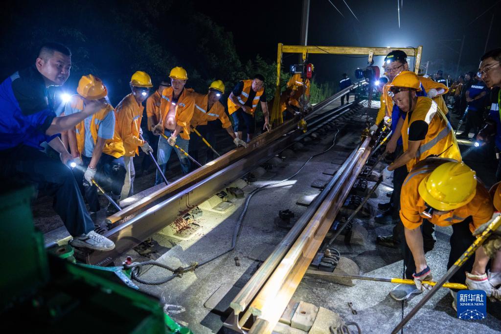 9月6日凌晨,鐵路工人在京廣高鐵株洲西至衡山西區(qū)間進行換軌施工。