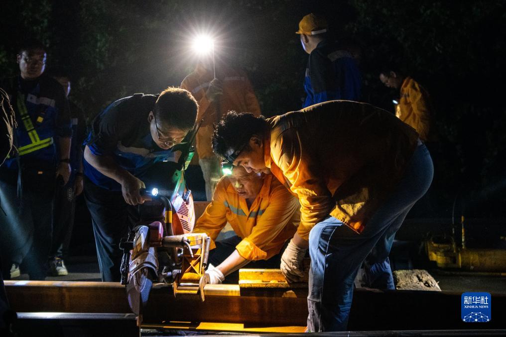 9月6日凌晨,鐵路工人在京廣高鐵株洲西至衡山西區(qū)間進行換軌施工。