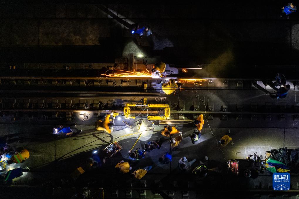 9月6日凌晨,鐵路工人在京廣高鐵株洲西至衡山西區間進行換軌施工(無人機照片)。