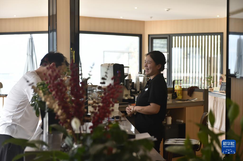 9月5日,林州市石板巖鎮一家“鄉村振興”公益項目民宿的工作人員(右)在接待來訪者。