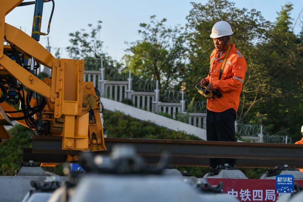 9月6日,在四川省瀘州市馮灣特大橋施工現場,技術人員在操縱智能鋪軌機進行鋪軌施工。