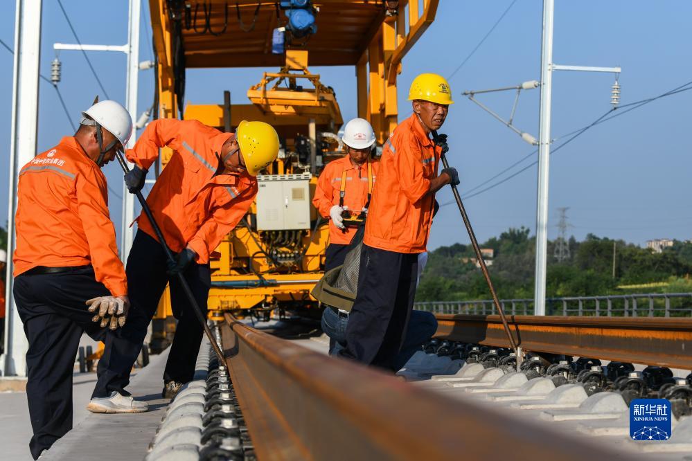 9月6日,在四川省瀘州市馮灣特大橋施工現場,工人在進行鋪軌施工。