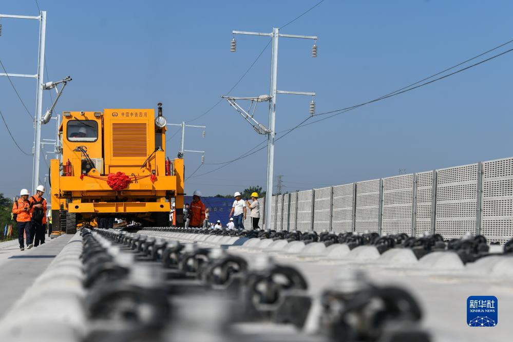 9月6日,在四川省瀘州市馮灣特大橋施工現場,智能鋪軌機在進行鋪軌施工。