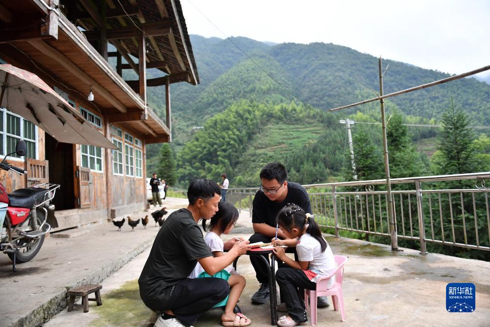 9月4日,報木小學的校長段同山(左一)和教師羅瀟在學前班學生奉昕妤(左二)、鄒紫怡家中家訪,教她們復習當天的學習內容。