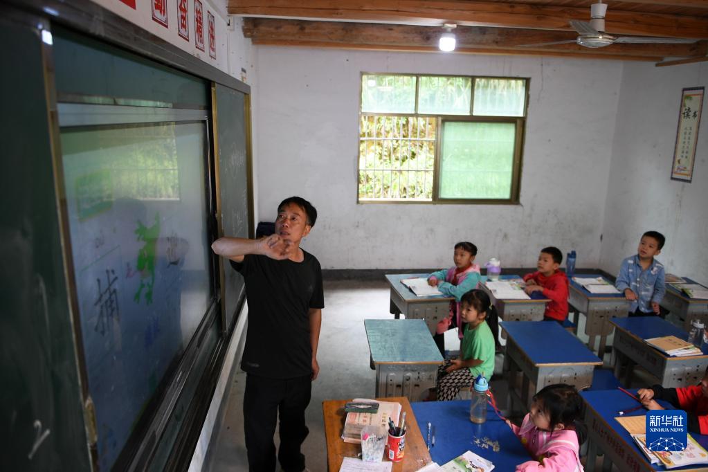 9月4日,報木小學校長段同山在給二年級和學前班的學生們上課。