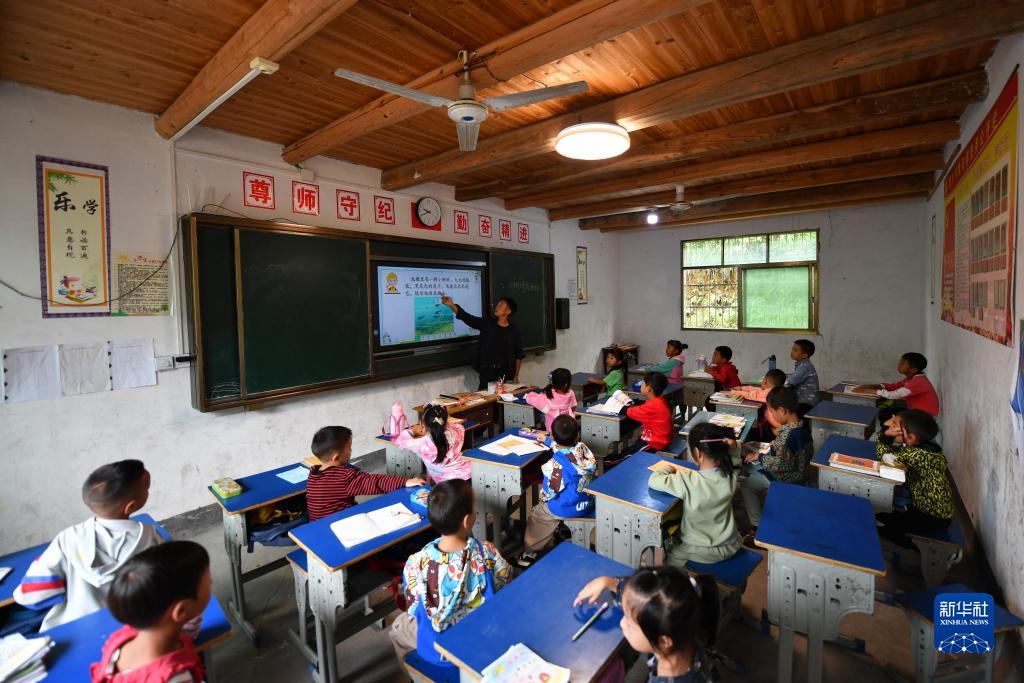9月4日,報木小學校長段同山在給二年級和學前班的學生們上課。