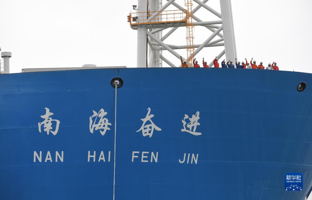 9月6日,在深圳孖洲島的友聯船廠,“南海奮進”FPSO上的工作人員出發時向著岸上揮手。