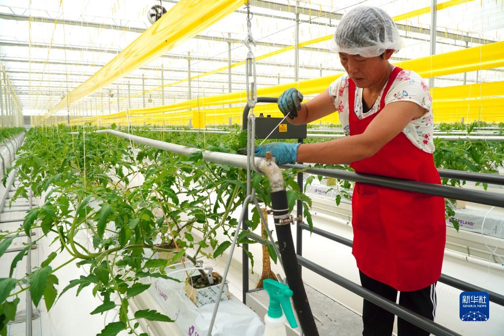 9月6日,在山東省昌邑市飲馬鎮,蔬菜種植戶在高標準種植大棚里培育西紅柿秧苗。
