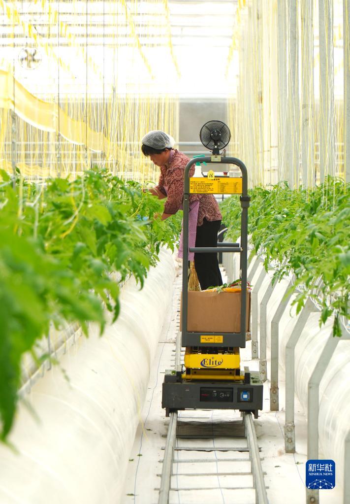 9月6日,在山東省昌邑市飲馬鎮,蔬菜種植戶在高標準種植大棚里培育西紅柿秧苗。