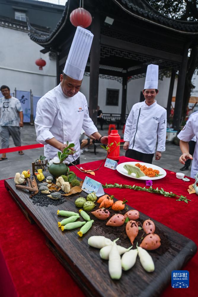 9月6日,在浙江省建德市壽昌古鎮開幕的古鎮好吃節上,由建德市餐飲協會制作的“魚躍亞運”“騰龍飛天”“亞運定勝”“金牌滿堂”等多道亞運主題菜品在現場展示,吸引了眾多市民的眼球。