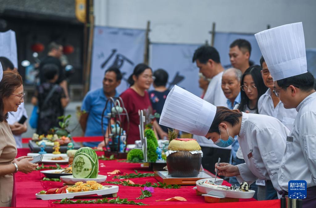 9月6日,在浙江省建德市壽昌古鎮開幕的古鎮好吃節上,由建德市餐飲協會制作的“魚躍亞運”“騰龍飛天”“亞運定勝”“金牌滿堂”等多道亞運主題菜品在現場展示,吸引了眾多市民的眼球。
