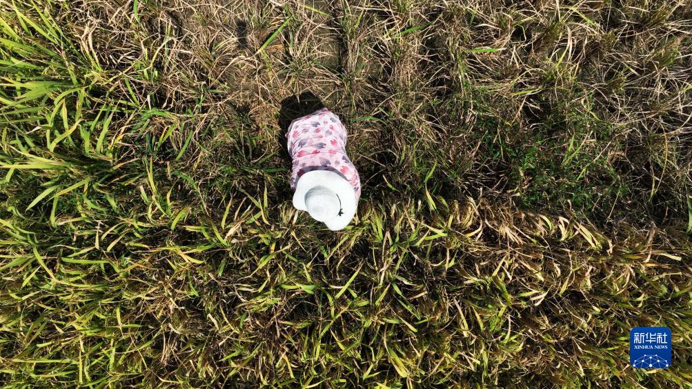 9月6日,村民在貴州省黔東南苗族侗族自治州黃平縣舊州鎮萬畝大壩搶收稻谷(無人機照片)。