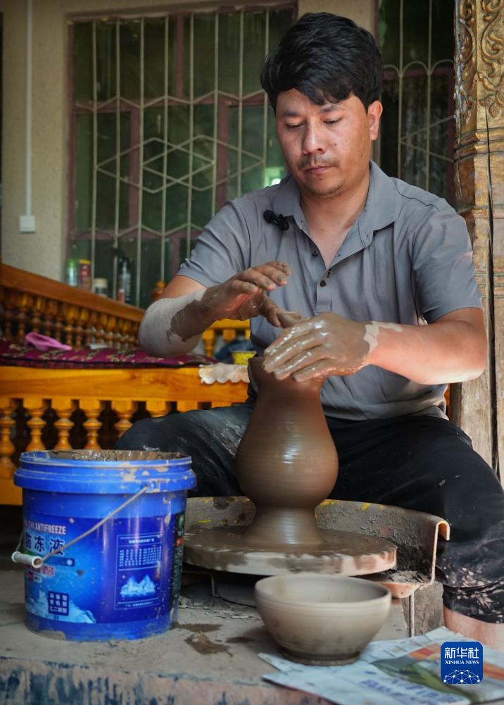 9月5日,手工藝人在英吉沙縣芒辛鎮恰克日庫依村制作土陶。