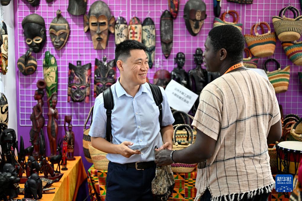 9月6日,一名參觀者在服貿會文旅服務專題展區(qū)烏干達展臺購買手工藝品。