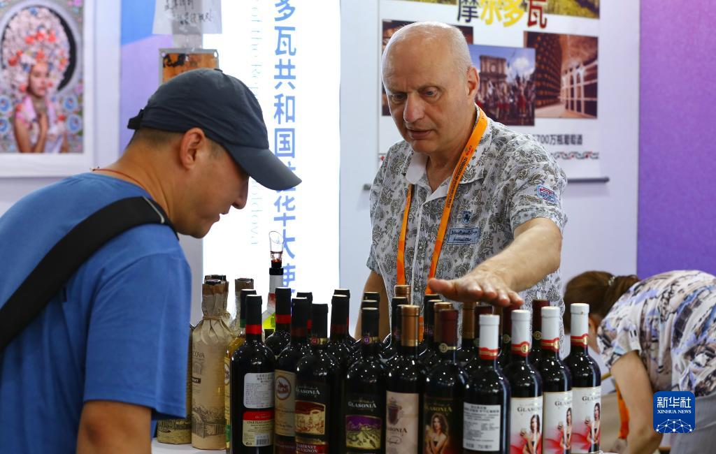 9月6日,參觀者(左)在在服貿會文旅服務專題展了解摩爾多瓦葡萄酒。