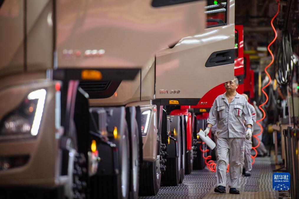 9月6日,在東風商用車有限公司車輛工廠,工人準備接車下線。