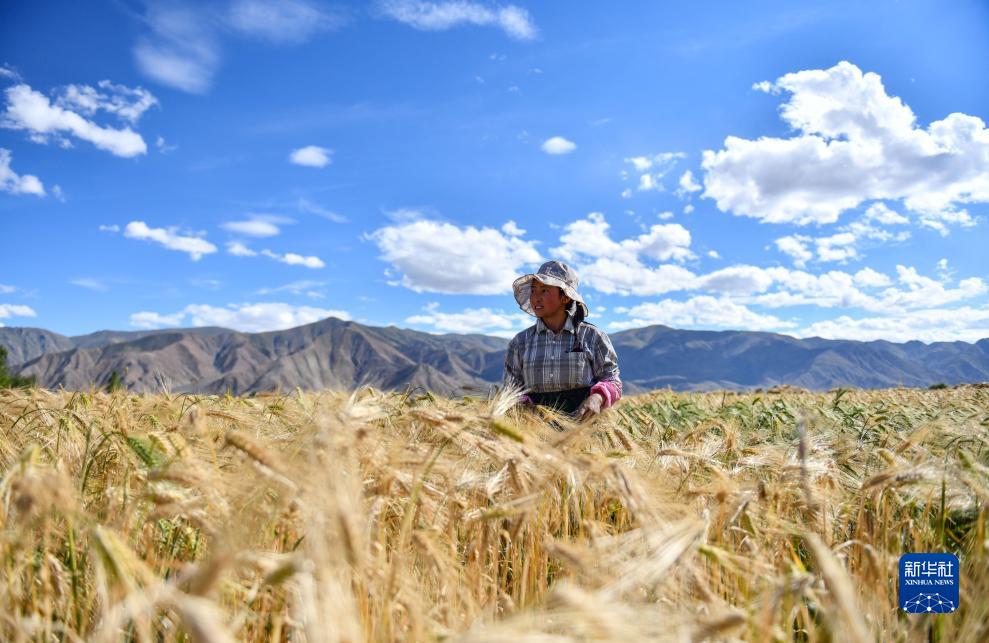 西藏日喀則市年楚河流域是西藏糧食的主產區之一,今年雨水豐沛,糧食長勢喜人,大地鋪金,農民喜迎豐收。新華社記者 晉美多吉 攝