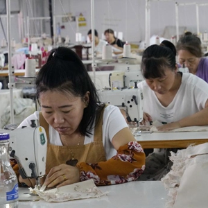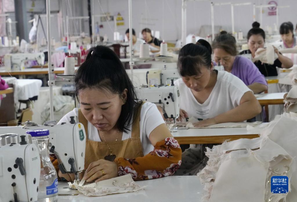 9月6日,工人在遵化市石門鎮一家服裝加工企業的生產車間工作。