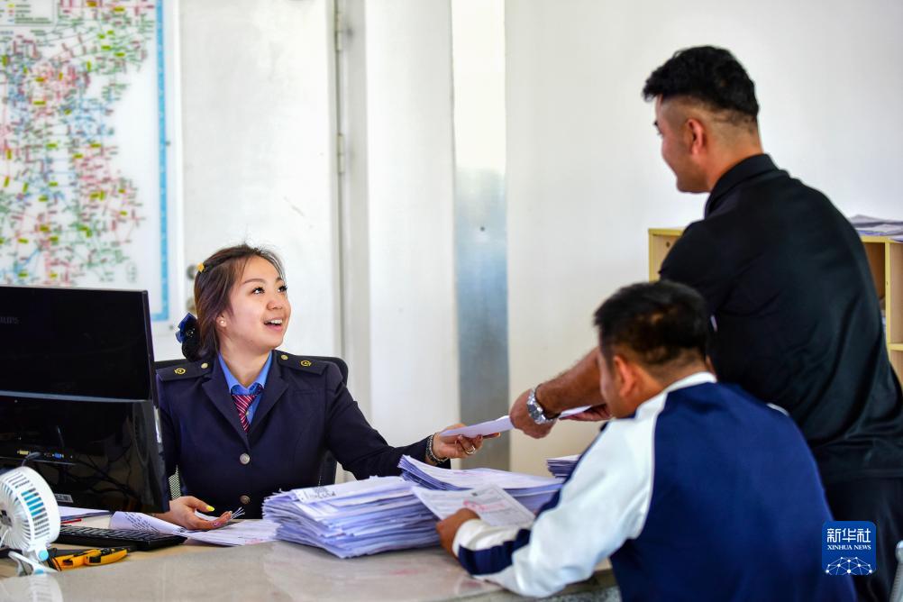 9月6日,霍爾果斯鐵路口岸站聯運大廳內,出口貨運員呂思琪(左)在為客戶辦理更正國際聯運運單業務。