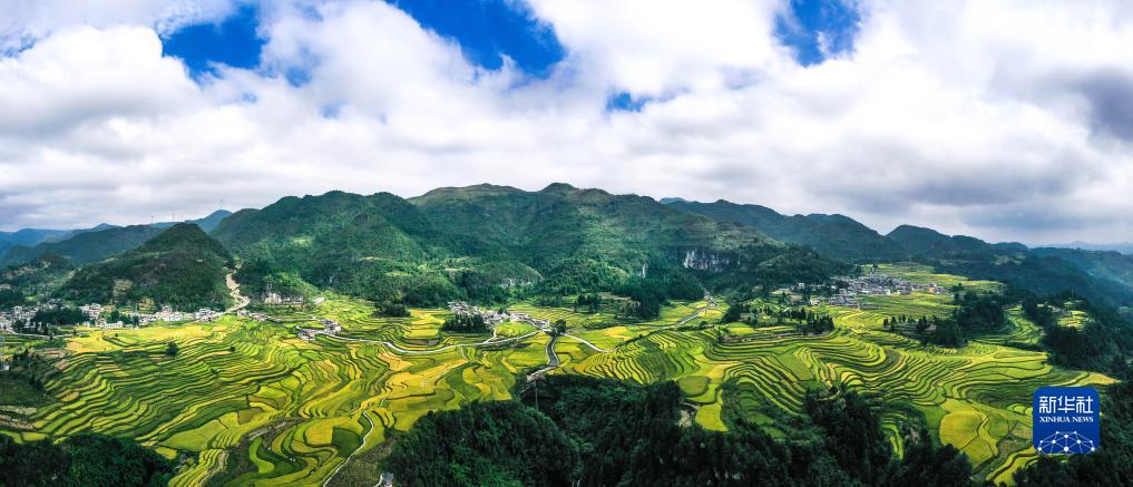白露將至,貴州省黔南布依族苗族自治州貴定縣沿山鎮臘利梯田里的水稻逐漸成熟,呈現出一幅豐收在望的秋日畫卷。