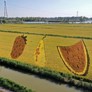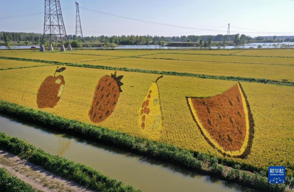 初秋時節,遼寧省鞍山市臺安縣遼河文化旅游景區的稻田畫吸引不少游客前來參觀游覽。由多種顏色組成的巨型稻田畫勾勒出豐收壯美景象。