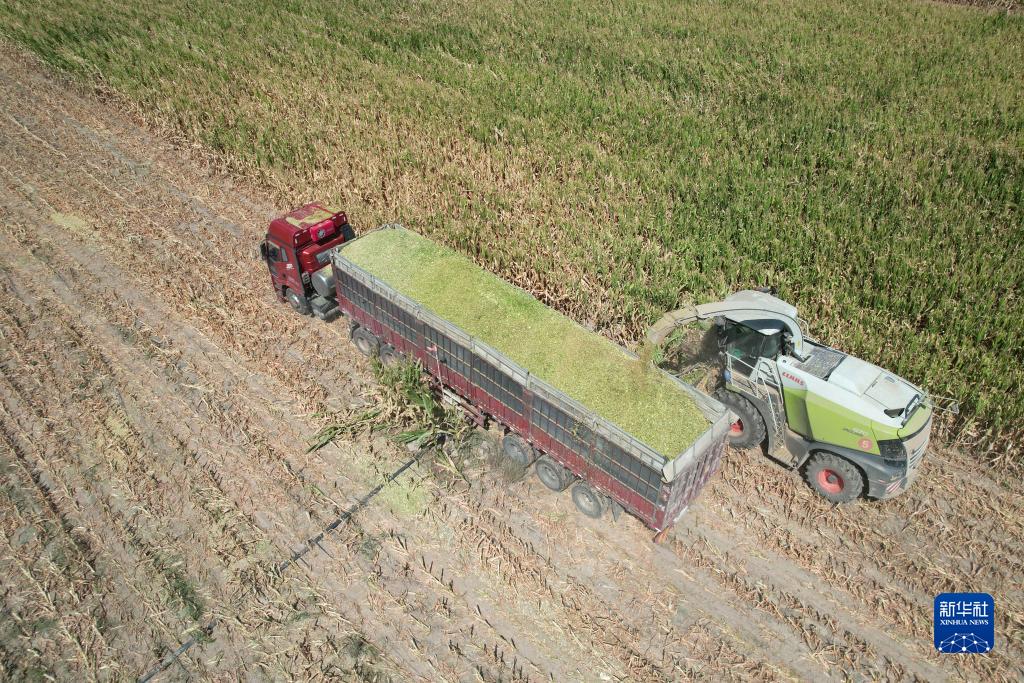 9月6日,在金昌市永昌縣六壩鎮八壩村,工作人員使用大型機械收獲青貯玉米(無人機照片)。