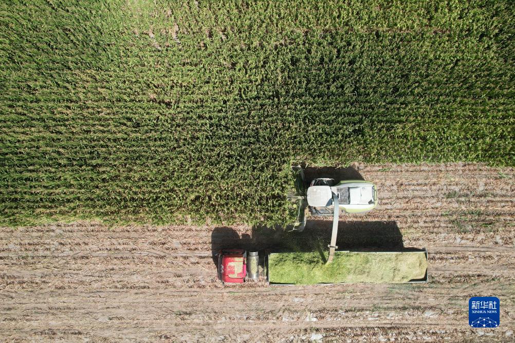 9月6日,在金昌市永昌縣六壩鎮八壩村,工作人員使用大型機械收獲青貯玉米(無人機照片)。
