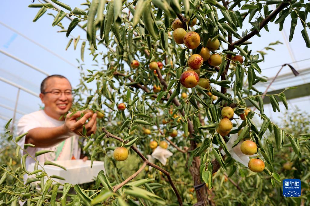 9月6日,在山東省濱州市沾化區黃升鎮一處冬棗園內,棗農在采摘冬棗。