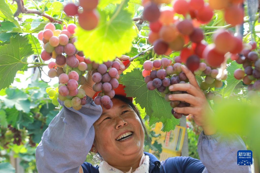 9月7日,山東省高密市闞家鎮(zhèn)松興屯村葡萄大棚內(nèi),村民在采摘葡萄。