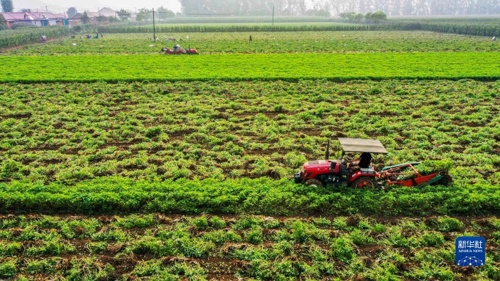 9月6日,河北省遵化市劉備寨鄉安各寨村農民駕駛農機收獲花生(無人機照片)。