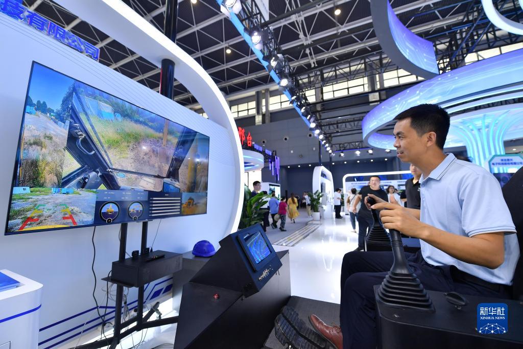 9月7日,參觀者在2023中國國際數字經濟博覽會上體驗挖掘機5G遠程駕駛系統。