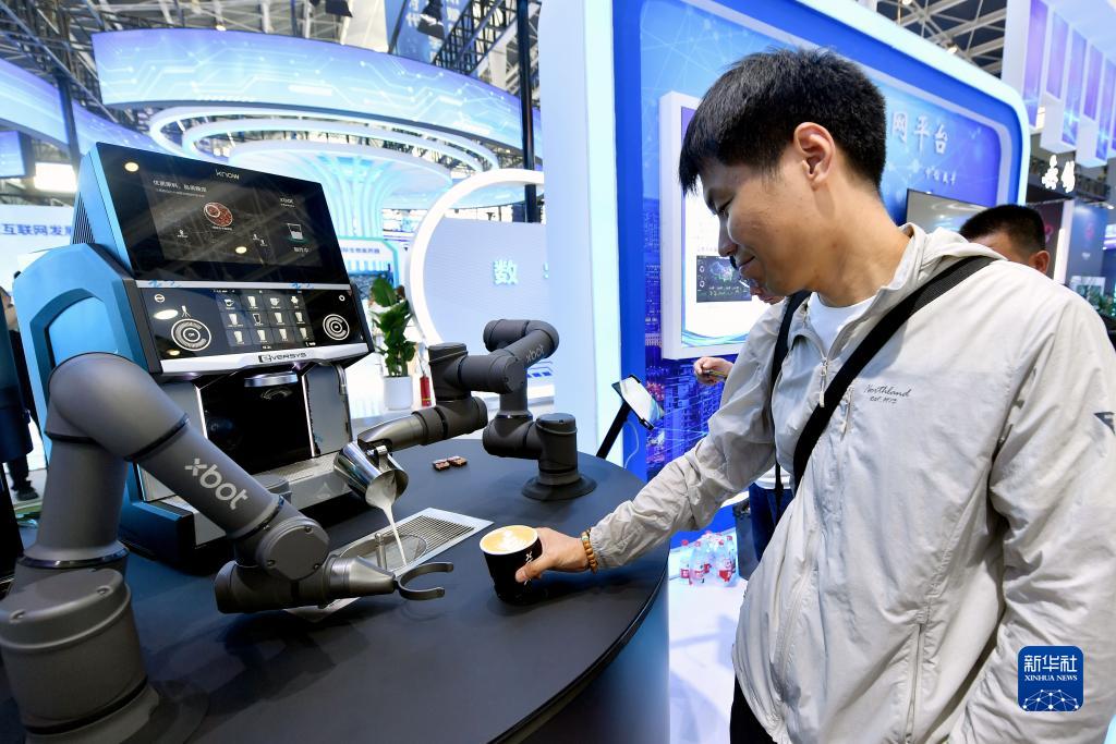 9月7日,參觀者在2023中國(guó)國(guó)際數(shù)字經(jīng)濟(jì)博覽會(huì)上體驗(yàn)艾博咖啡機(jī)器人。
