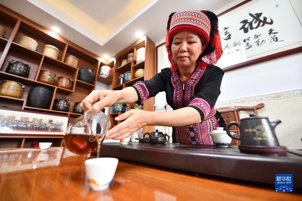在梧州市蒼梧縣六堡鎮(zhèn)山坪村,六堡茶制作技藝非遺傳承人祝雪蘭在工作室里泡茶(6月7日攝)。