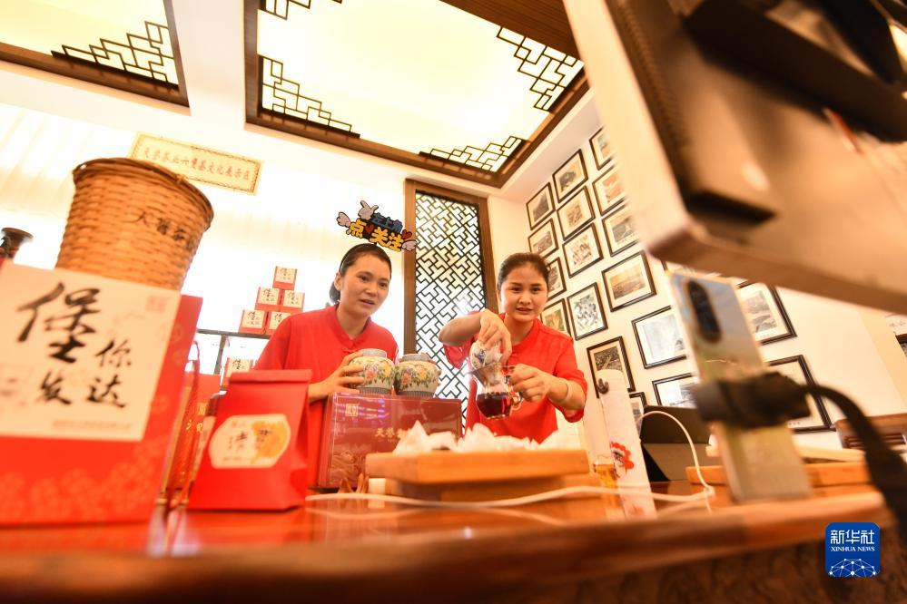 在梧州市龍圩區一家茶企,工作人員在直播帶貨(8月25日攝)。