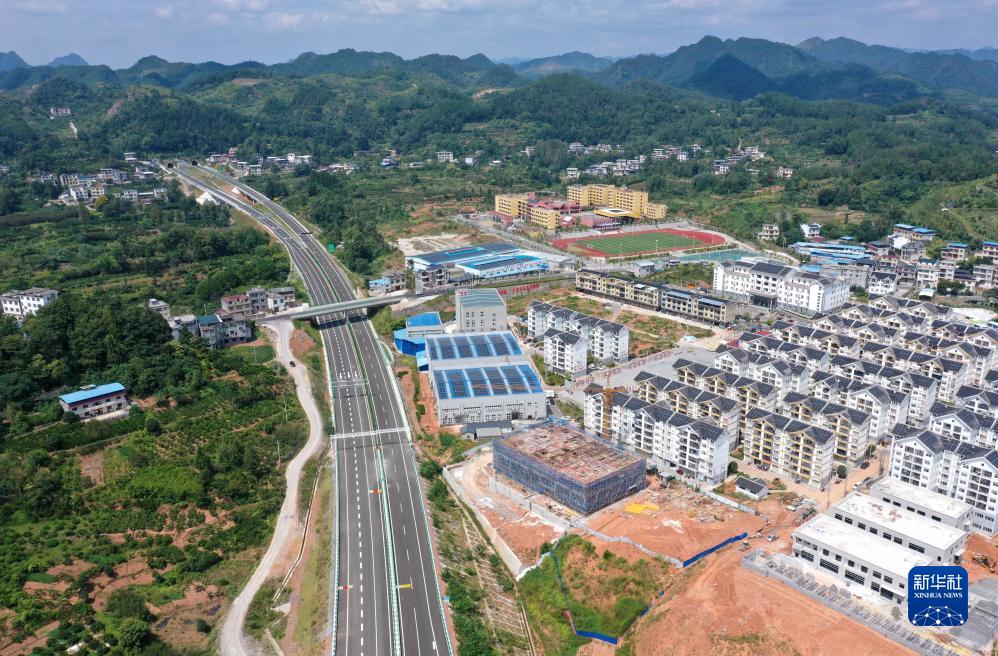 9月7日拍攝的湖北省宣恩縣李家河鎮一易地扶貧安置小區旁的宣咸高速路段(無人機照片)。