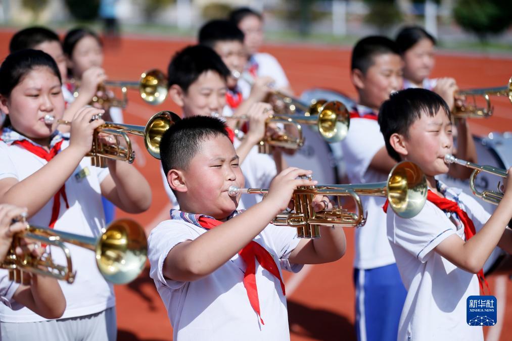 9月7日,山東省青島市即墨區(qū)龍山中心小學(xué)的學(xué)生在學(xué)習(xí)吹號。