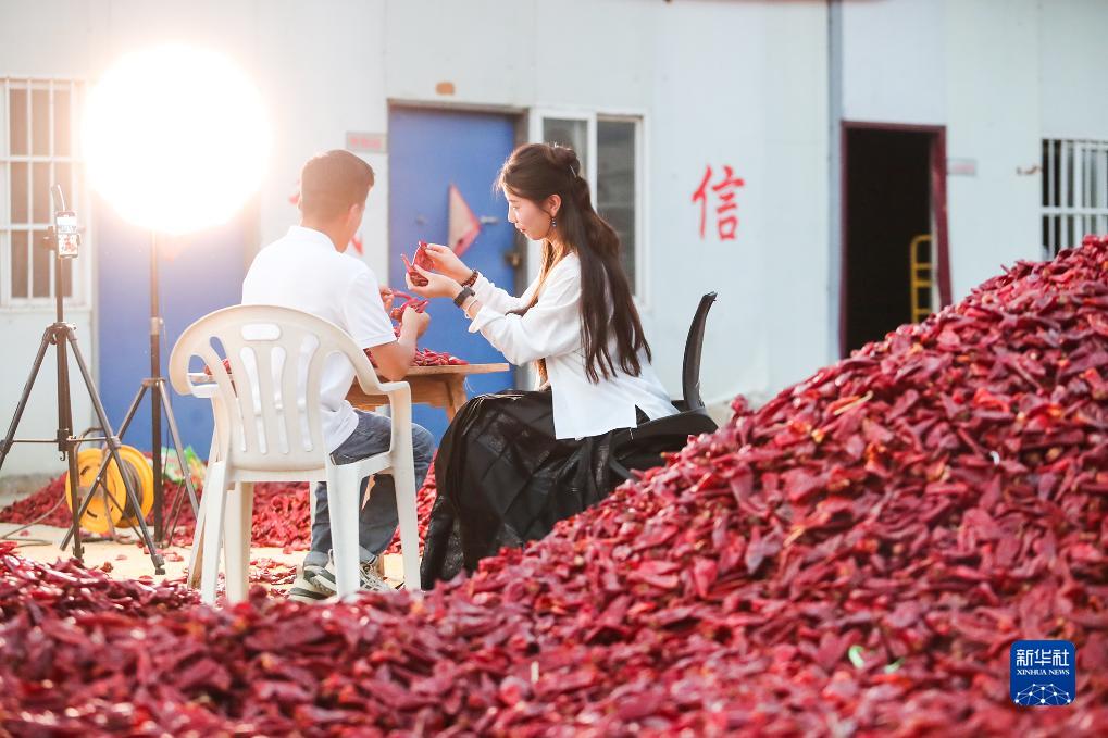 9月6日,在河南省商丘市柘城縣辣椒加工企業,當地電商主播在直播銷售辣椒產品。